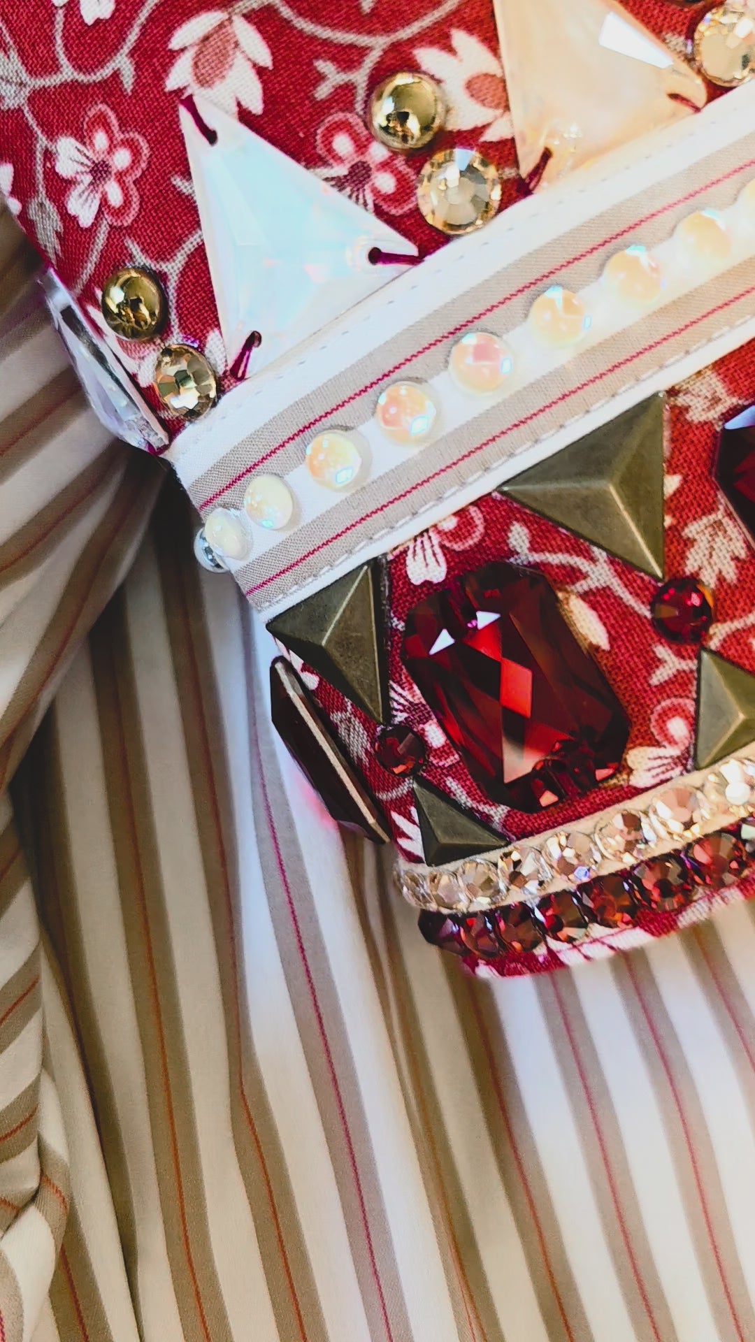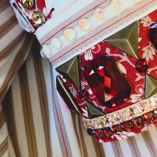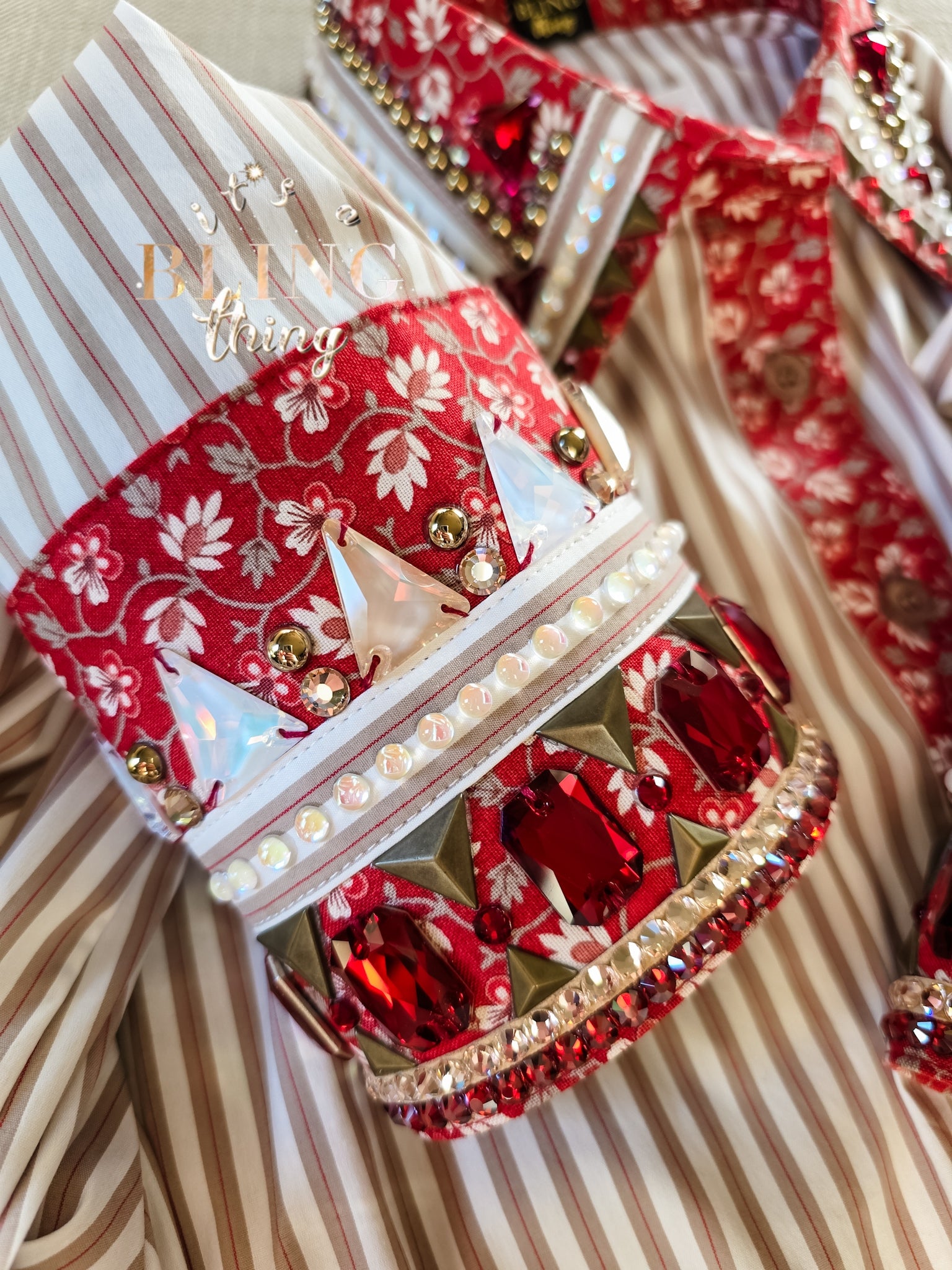If you are a fan of red in the show pen, this shirt is such a standout! The pretty contrast of the red floral on tan stripes caught my eye and I knew it would be stunning with a touch of sparkle. This design features antique gold and rich red accents on the collar and cuffs.